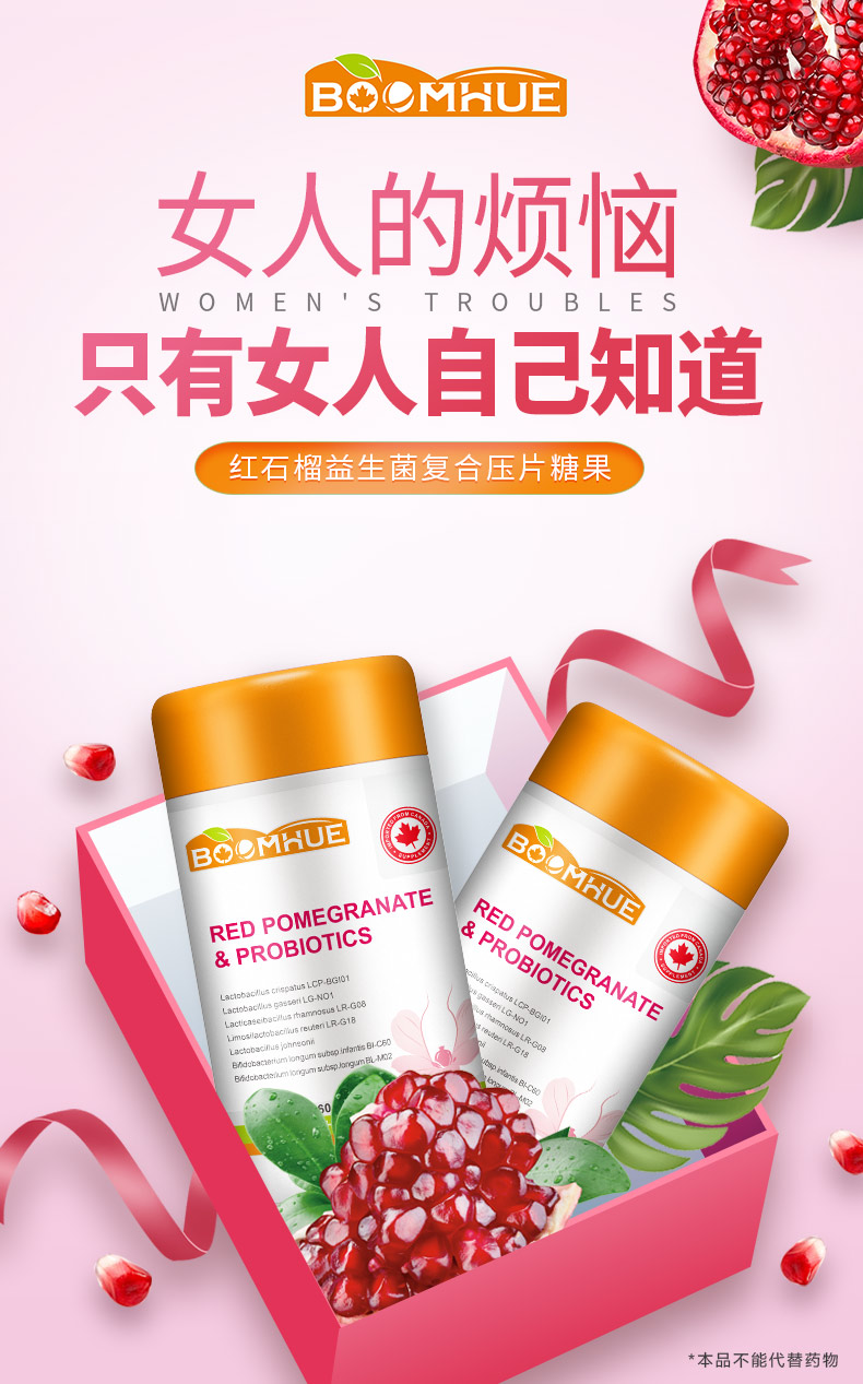 BOOMHUE博唤红石榴益生菌复合压片糖果,加拿大原瓶原装进口营养保健品,核心成分为红石榴和多种益生菌,能呵护女性私密健康,平衡菌群环境。面向全国招商代理,也可OEM贴牌代加工!