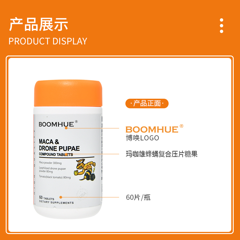 BOOMHUE博唤玛咖雄蜂蛹复合压片糖果,一款来自美国原品原装进口的营养保健品,科学配比,安全有效,让男人“雄风”在线!面向全国招商代理,也可OEM贴牌代加工