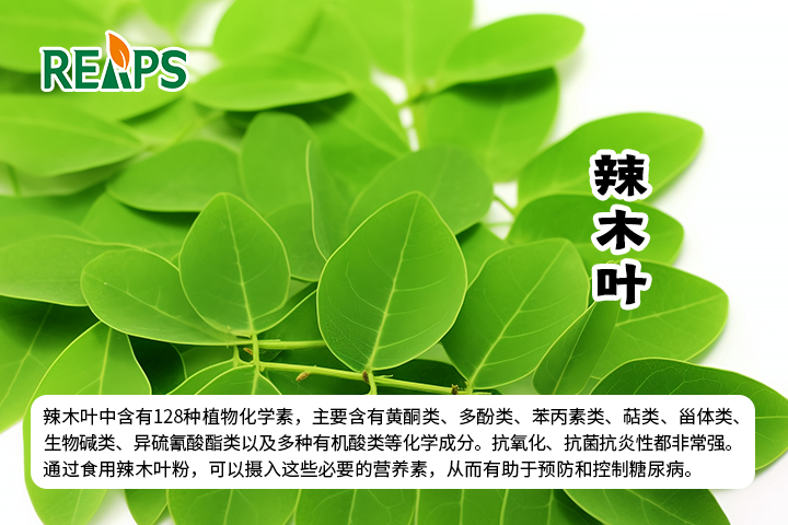 辣木叶中含有128种植物化学素,主要含有黄酮类、多酚类、苯丙素类、萜类、甾体类、生物碱类、异硫氰酸酯类以及多种有机酸类等化学成分。抗氧化、抗菌抗炎性都非常强。辣木叶粉富含铬、锌、硒、镁、钙和钒等微量元素,这些元素在体内缺乏可能导致胰岛素分泌紊乱或利用障碍。通过食用辣木叶粉,可以摄入这些必要的营养素,从而有助于预防和控制糖尿病。
