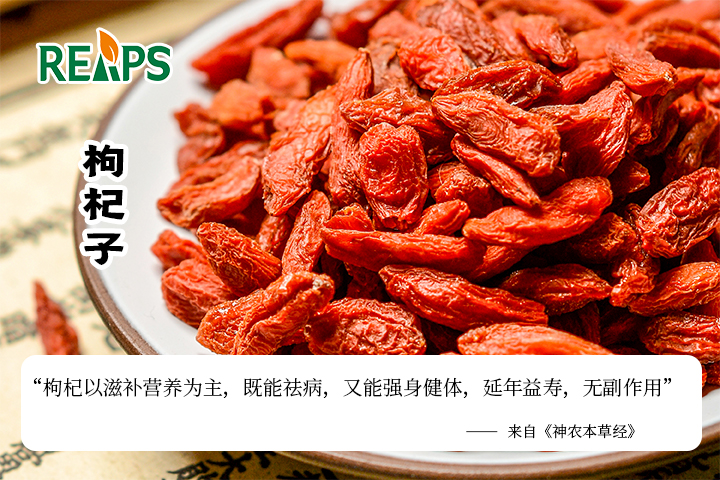枸杞子是一种红色的浆果,是生活中特别常见的养生食材,也是一种能温补肾阳的中药材,常被用于滋补肝肾、益精明目等。研究表明,枸杞子有免疫调节、抗氧化、抗衰老、抗疲劳、降血脂、降血糖、降血压、保肝、明目、排毒、保护生殖系统、抗辐射损伤等功效。